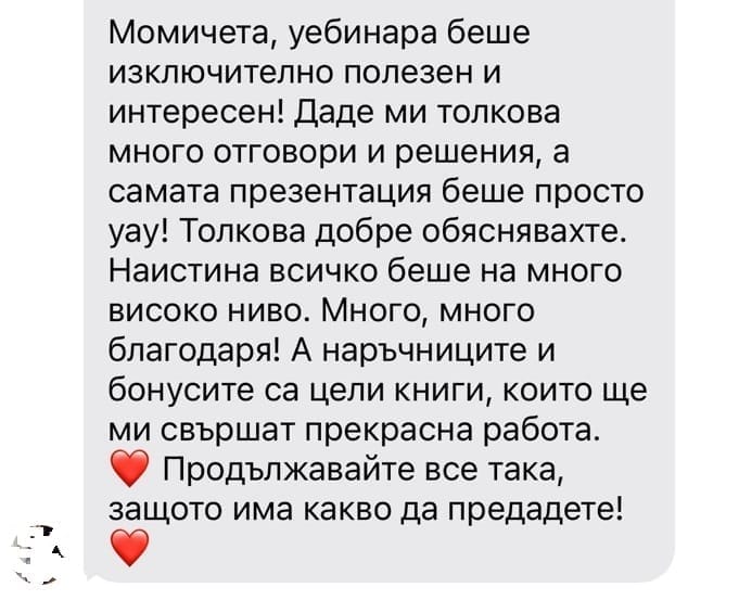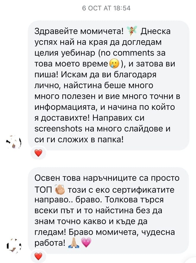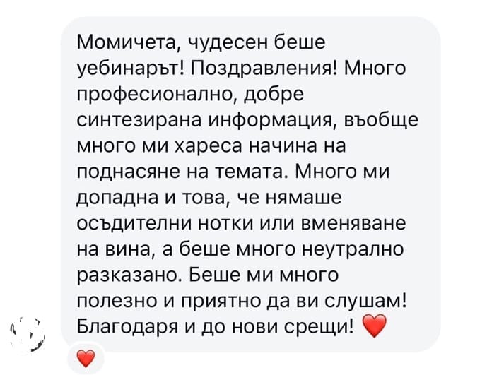 "Толкова ценна и практична информация! Благодарение на вашия IG Live за боите избегнах грешки, които щяха да ми струват доста нерви, а и пари. Детската стая вече е уютна и спокойна, без миризми и без токсични материали."